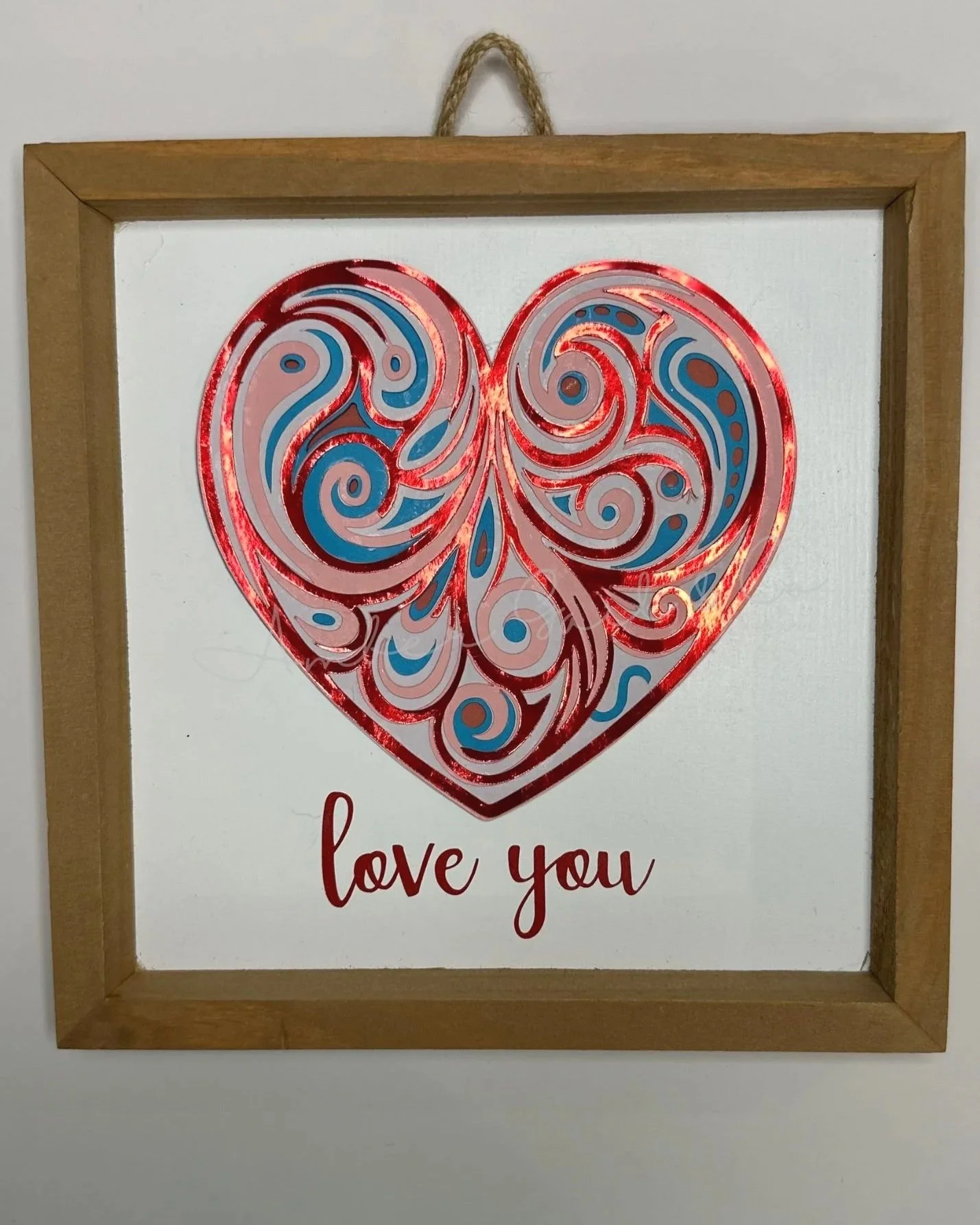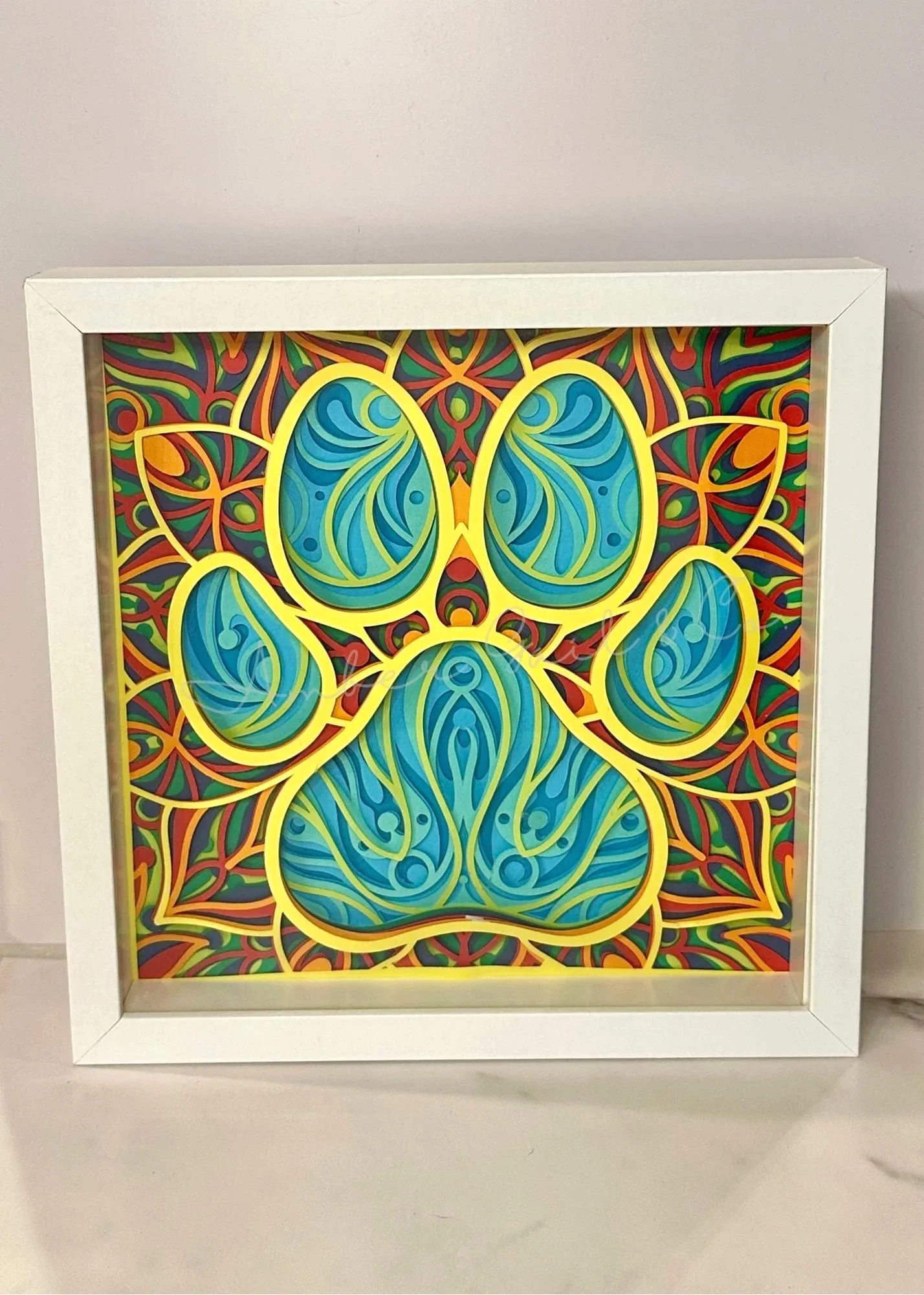 Celebrate the bond between pets and their people with this enchanting layered paper art shadow box. Featuring a dog and cat sitting side by side, gazing up at a night sky filled with golden stars and a glowing yellow heart, the design is framed within a large heart shape. Multiple layers in shades of blue and white create stunning depth and dimension, while cloud and foliage details add to the dreamy scene. Encased in a crisp white frame, this handcrafted piece is perfect for pet lovers and makes a heartfelt gift for any occasion.